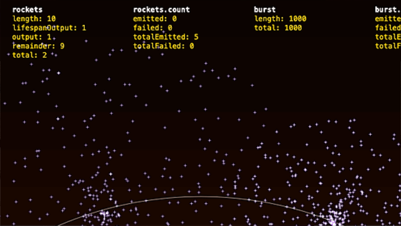 A particle system demonstration with two emitters. Rockets launch upward then trigger burst particles on death, creating realistic firework explosions with alpha fade effects.