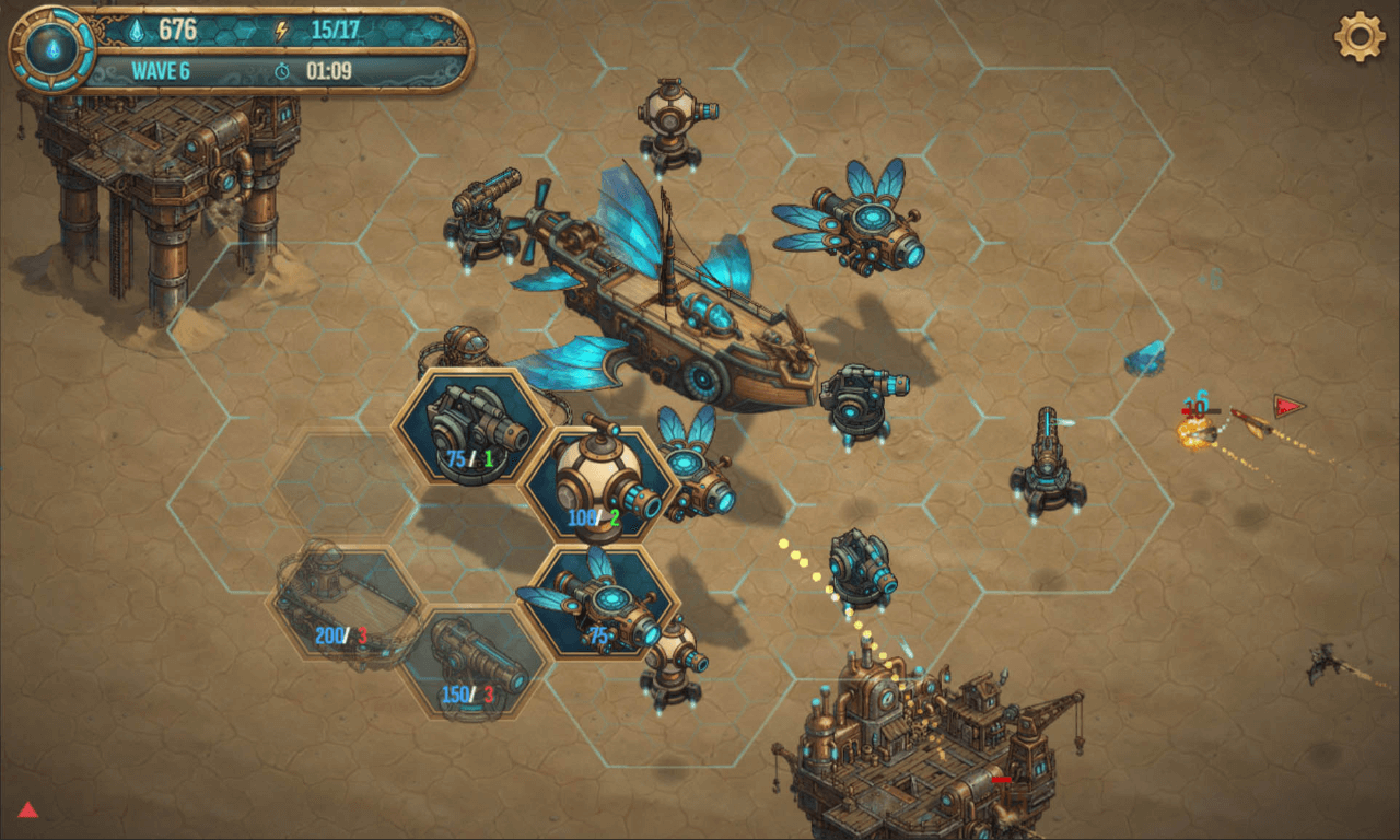 HEXSTORM: Tears of Arcadia combines steampunk aesthetics with tower defense strategy on a moving battlefield. The game features interconnected energy networks where every component matters.