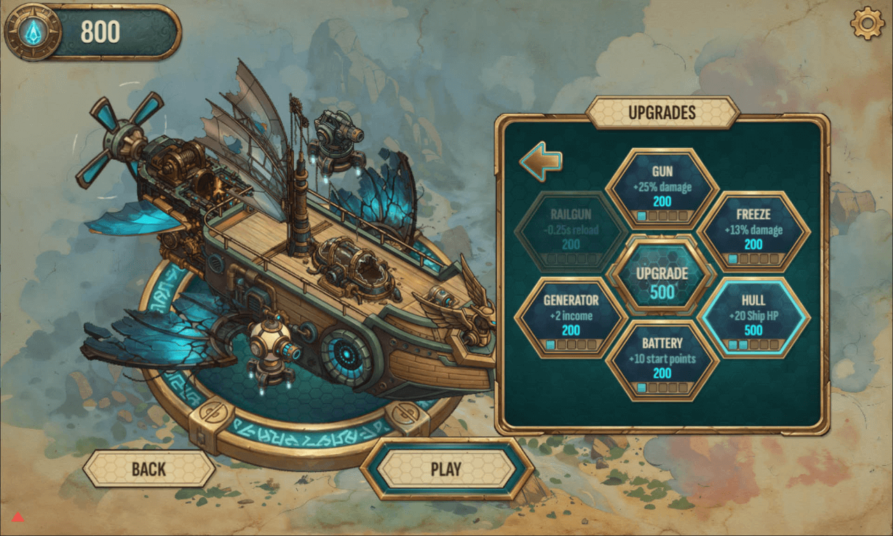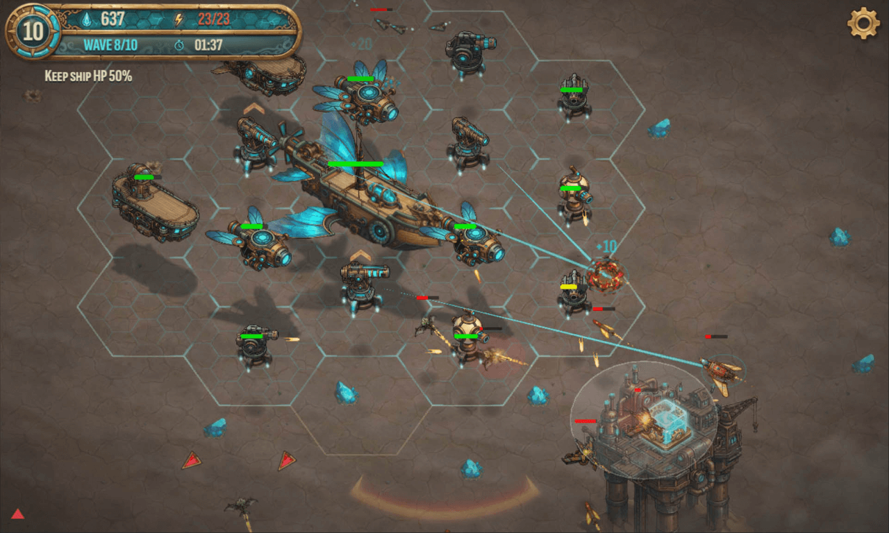 Players command the Arcadia, a flying frigate navigating through the world of Khoral. The tower defense mechanics demand strategic thinking as enemies attack from all directions. Each battle brings unique conditions through roguelike structure.