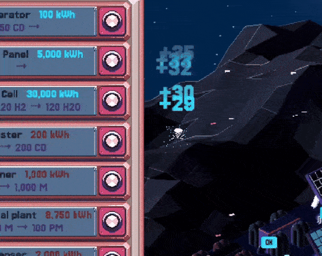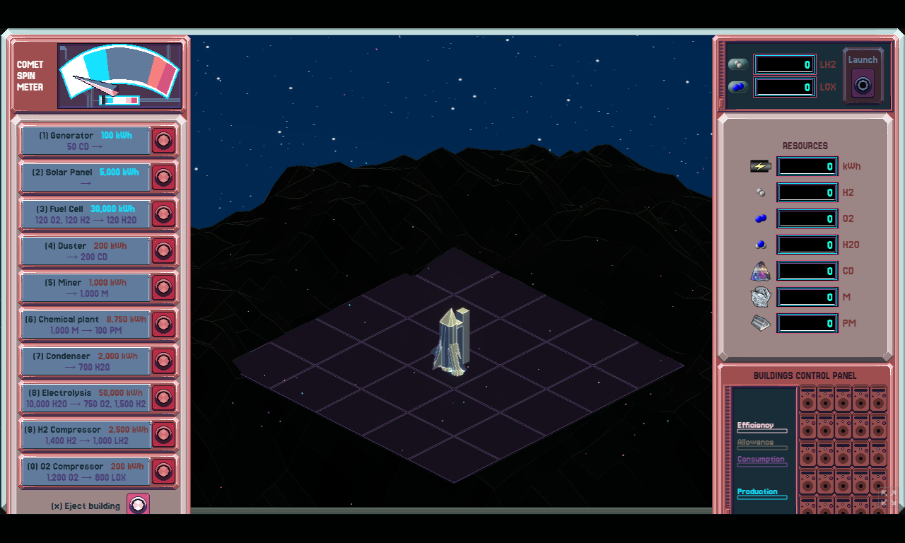 You start with nothing and work your way up through a chain of buildings — generators, solar panels, fuel cells, chemical plants, and more — each feeding into the next. The comet keeps spinning, resources are scarce, and figuring out the right build order is half the challenge. It's a space game that rewards patience and planning over reflexes. Average session is about half an hour.